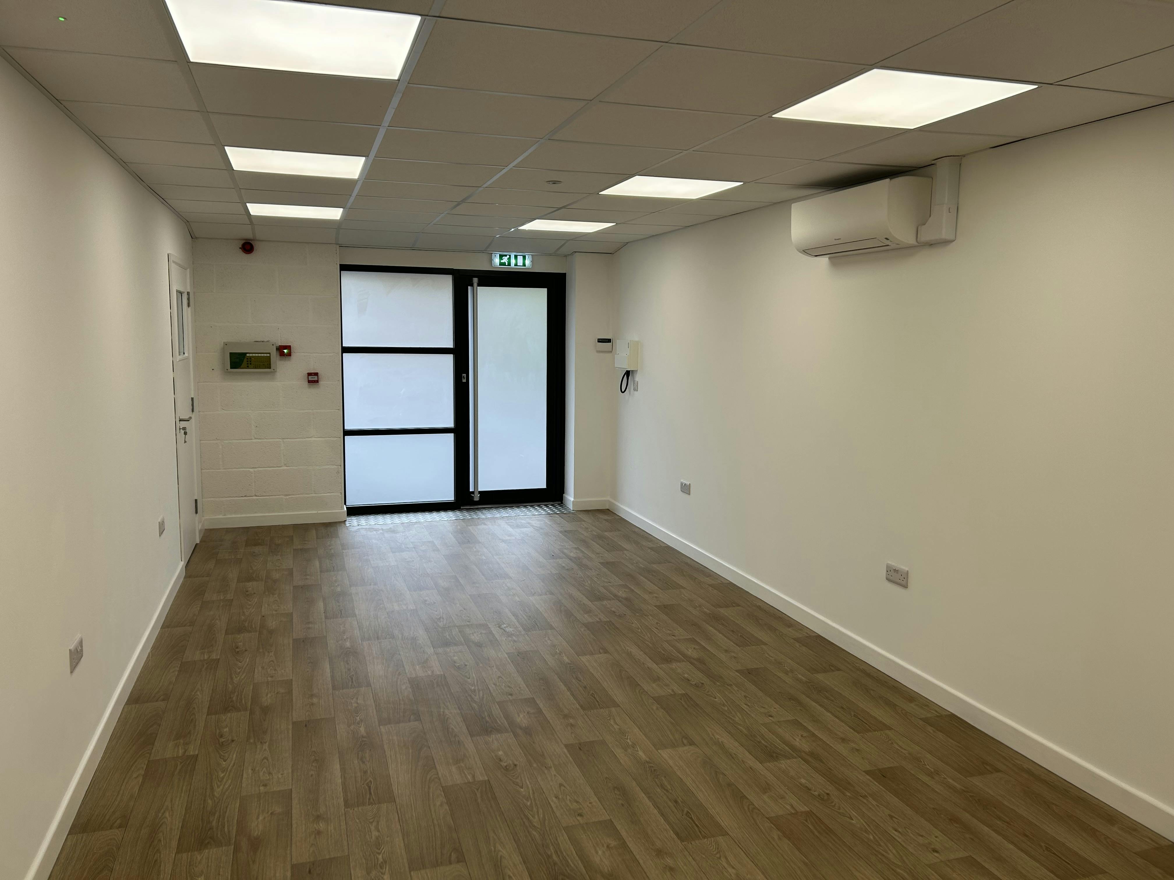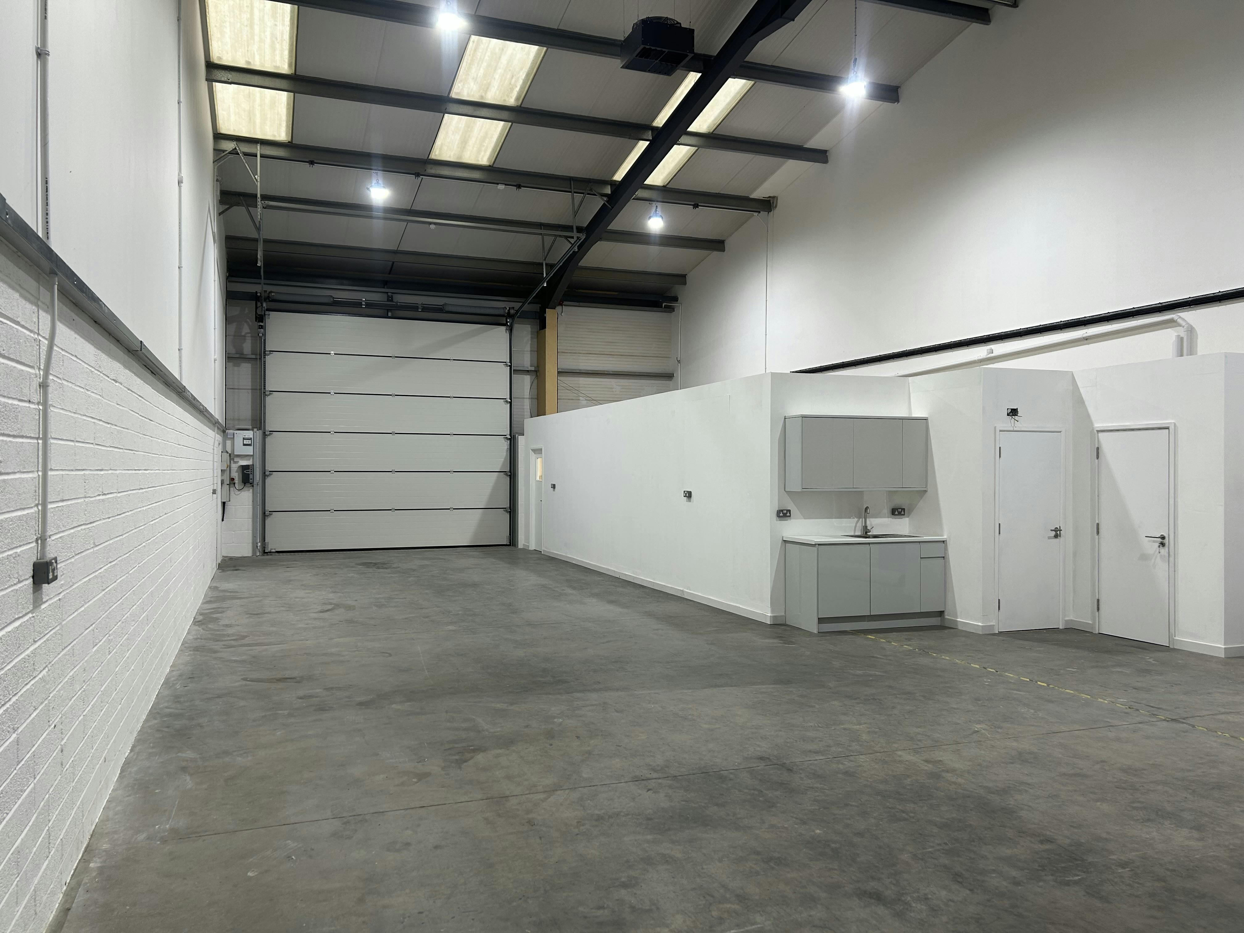 A modern mid terrace unit with a large goods loading and separate personnel door. The unit can be taken as one or split into a separate office and industrial unit. Flexible space each with WC's and Kitchenettes. Car parking to the front of the property (2 per unit). There is a possibility to have a separate front entrance door on the industrial unit if required. Office unit has Air Conditioning, Industrial unit has Gas Heating and 3 phase electricity availability. Eaves height (Unit) 4.8m